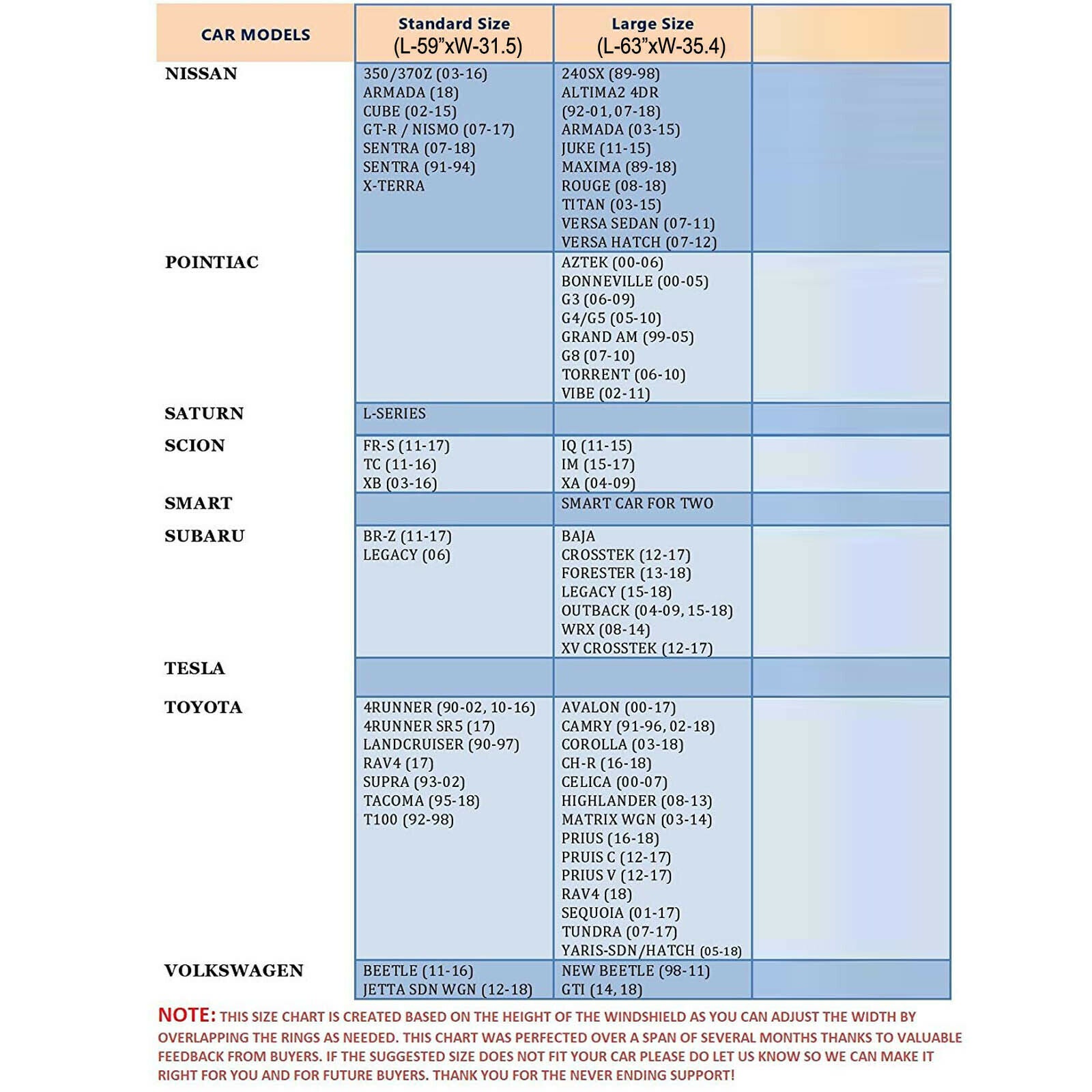 Standard Car Window Shade is L 59” x 31” W and is for car windshield that is no larger than L 59” x 29” W, It is best for smaller cars and windshields.
