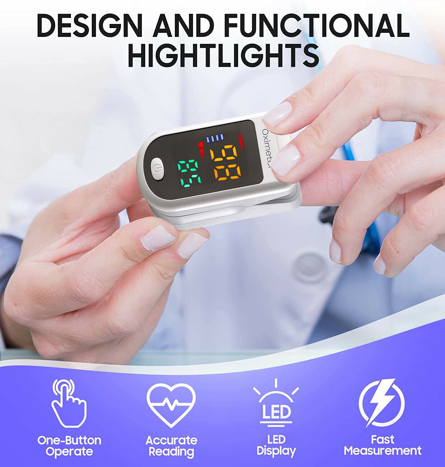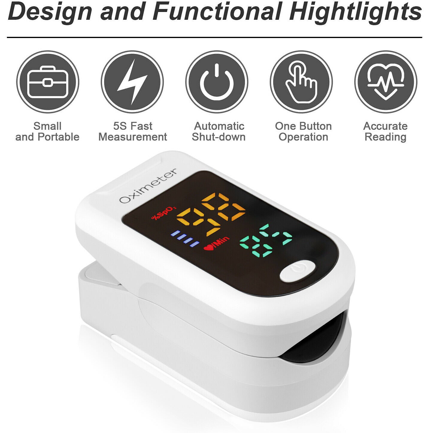 • ACCURATE AND RELIABLE - Accurately determine your SpO2 (blood oxygen saturation levels), pulse rate and pulse strength in 5 seconds and display it conveniently on a large digital four colors LED display. Also, Two-direction display makes it fit to be viewed from any angle.