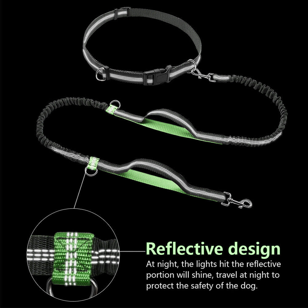 • IMPROVE DOG HABITS NOW: The three shock absorbing bungee cords will develop your dog lead manners day by day. The two Neoprene padded handles of the Dog Running Leash will help you control the dog in unexpected situations and your hands will never be sore again! The best hands free leash for large dogs!
