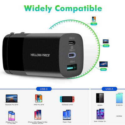 65W 3-Port USB C Charger GaN Power Delviery for MacBook, USB C Laptop, iPad Pro