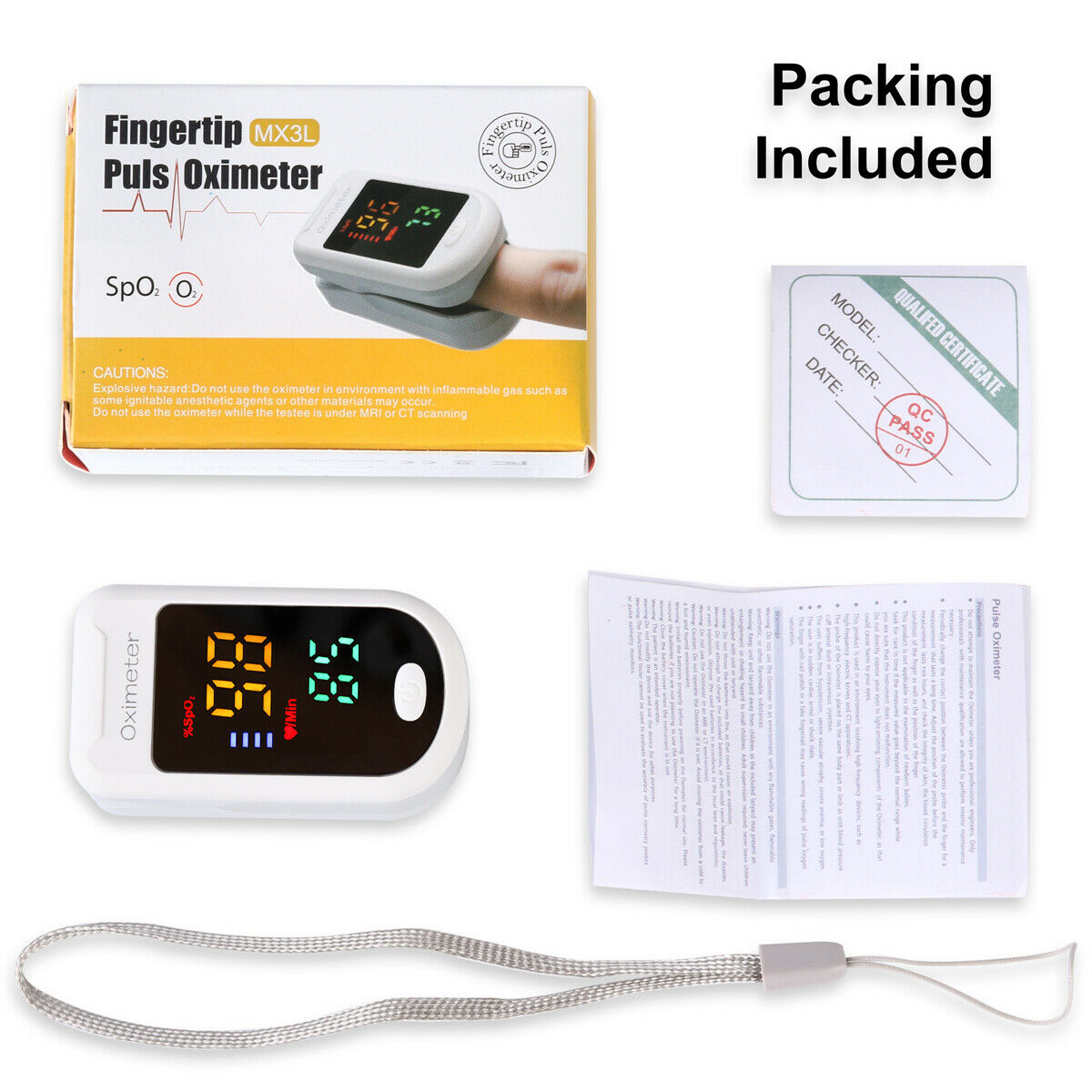 What you get: 1x Pulse Oximeter, Wrist Cord, User Manual ( 2x AAA batteries Not Included)