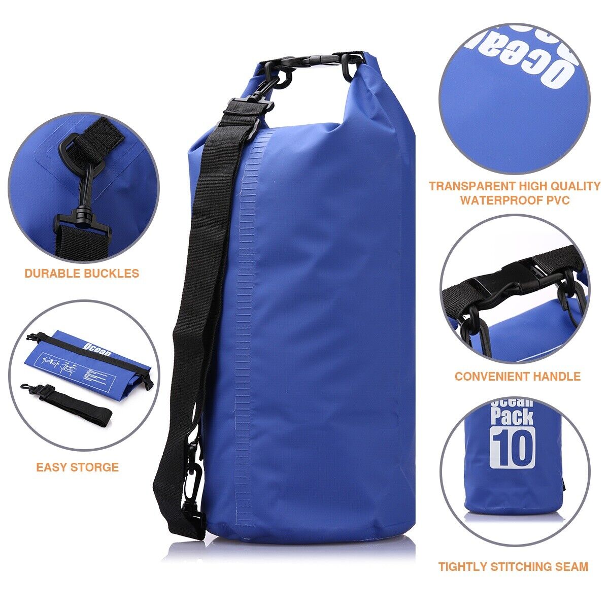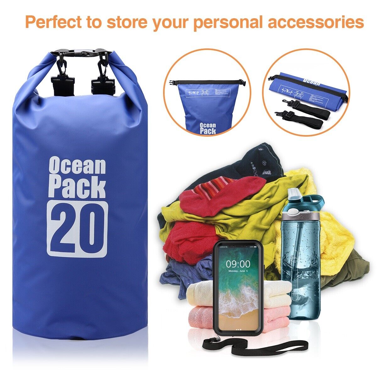 PERFECT SIZE KEEP YOUR ITEMS DRY AND PROTECTED Protect Your Valuables with our 10L, 20L Dry Bags meet your all needs to stay dry and still being able to easily carry. Roll top provides you an adjustable function