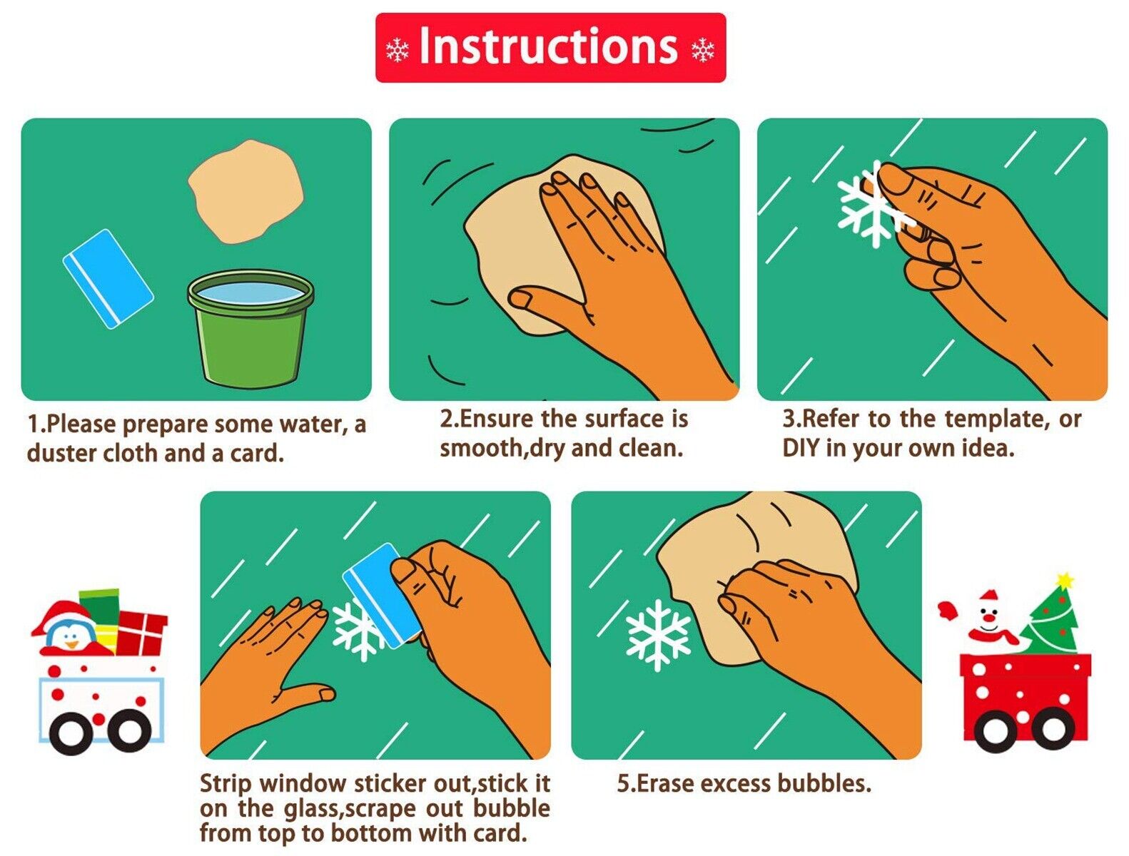 The Christmas decals are easy to use clean the smooth window surface first; peel off the sticker and stick it on the window; use a card to scrape out bubbles from top to bottom.