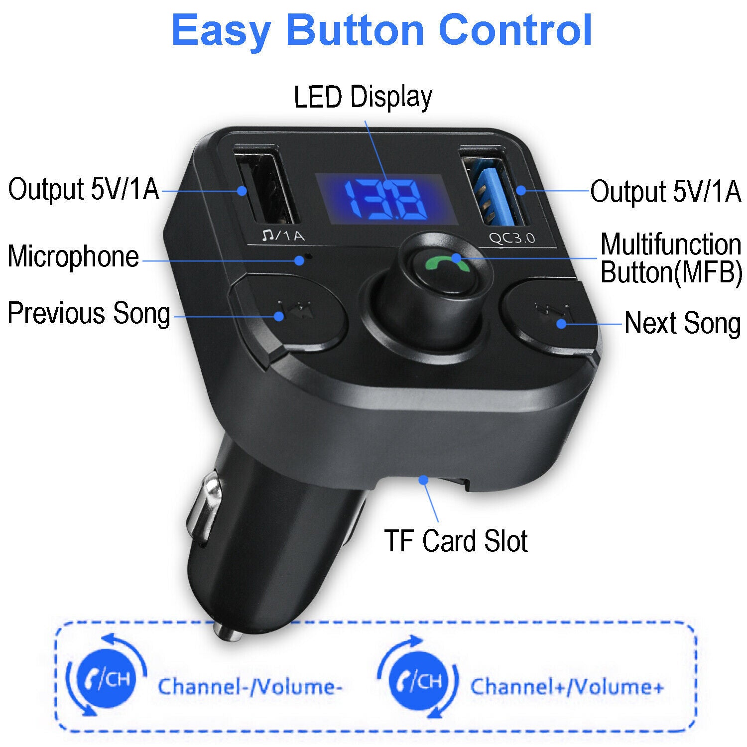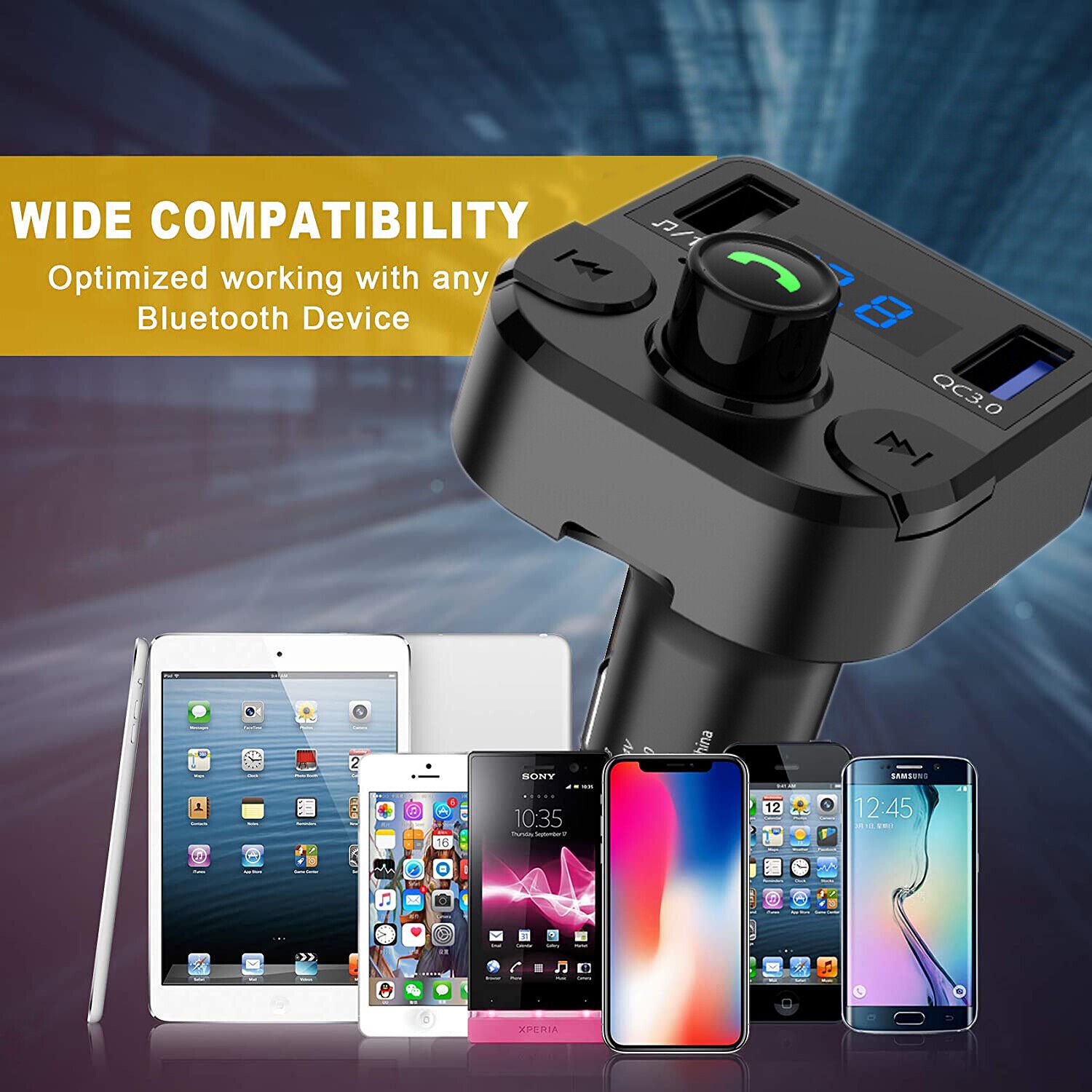 • Bluetooth 5.0 Technology - provides a stable connection and echo-cancellation can reduce background noises for better hands-free calls, so you can answer phone calls with a press of the button.The fm transmitter also has wide compatibility with all Bluetooth enabled devices, such as iPhone, iPad, LG ,Samsung, Tablet, HTC, Sony and other Android Smartphones; Also it will fit all of cars/trucks (12-24V).