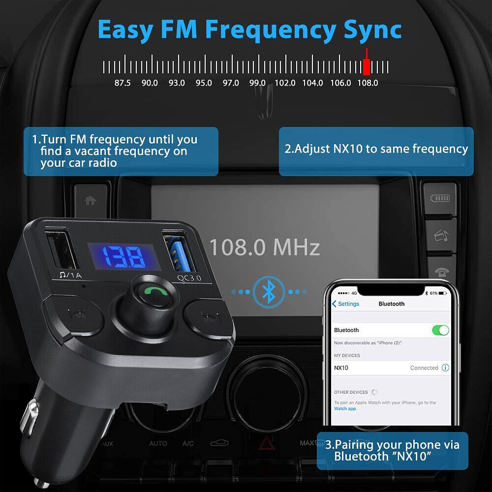 • Bluetooth 5.0 Technology - provides a stable connection and echo-cancellation can reduce background noises for better hands-free calls, so you can answer phone calls with a press of the button.The fm transmitter also has wide compatibility with all Bluetooth enabled devices, such as iPhone, iPad, LG ,Samsung, Tablet, HTC, Sony and other Android Smartphones; Also it will fit all of cars/trucks (12-24V).