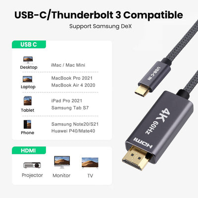 USB C to HDMI Adapter 4K@60Hz Cable [Thunderbolt 3 Compatible]+HDMI 2.0 HD Cable