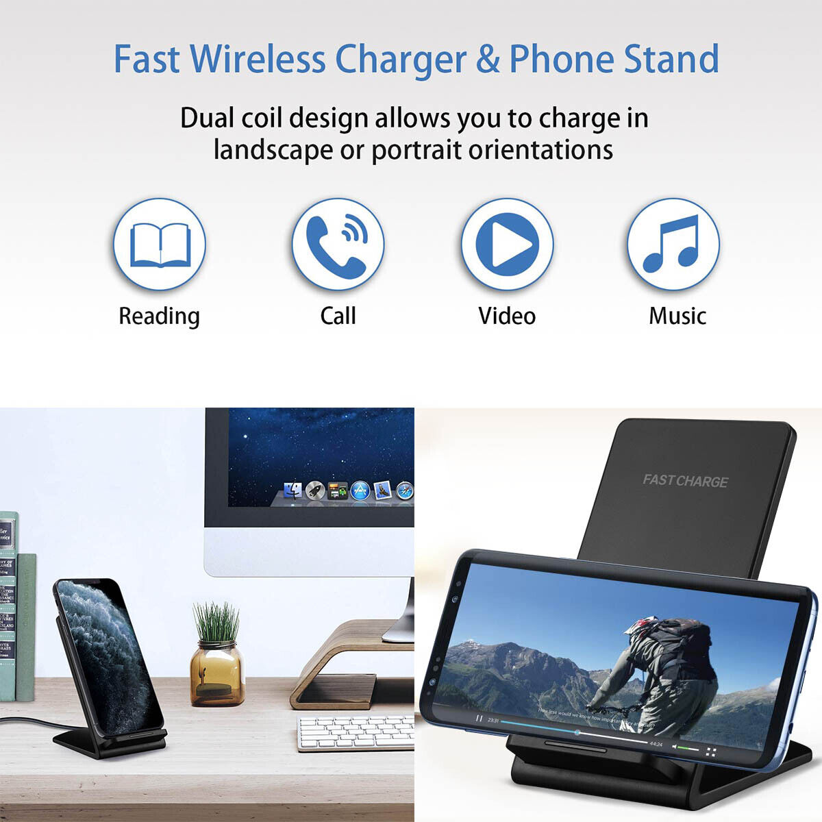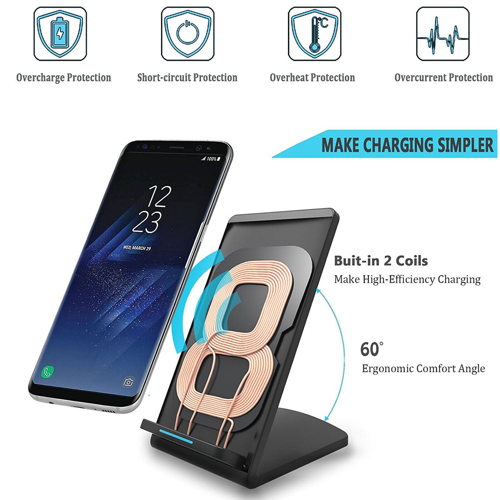 BUILT-IN 2-COIL FAST CHARGER - 1.6 times as fast as standard wireless chargers and can fully charge your device within 1.5-3 hours; Built-in 2 coils offer a wide charging area to allows you to place your phones horizontally or vertically to charge without affecting charging.