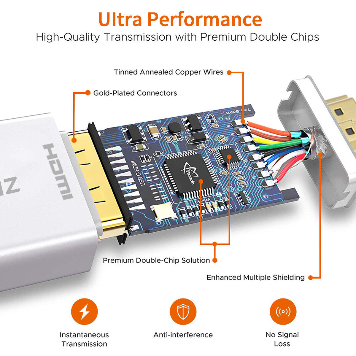 Supports 4K @60HZ UHD Resolution: USB-C and Thunderbolt 3 to HDMI cable can offer up to 4K video at 60Hz for your computer and display, supports resolution up to 3840x2160 and is also backward compatible with 1080P, 1080I and 720P,up to 60hz fast refresh rate, compatible a clear picture that reduces blurring during fast-action scenes and synchronously transmits audio and video signal, you never worry it will lag when transmit video.It's widely compatible with Windows 10/Vista/XP,Mac OSX.