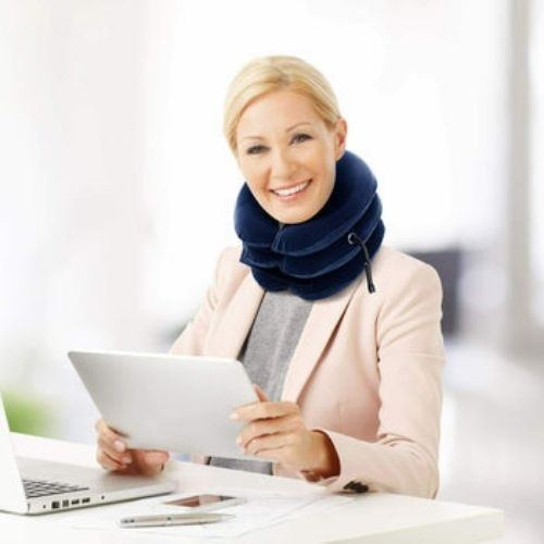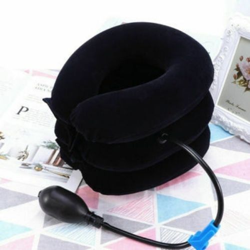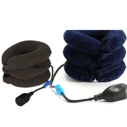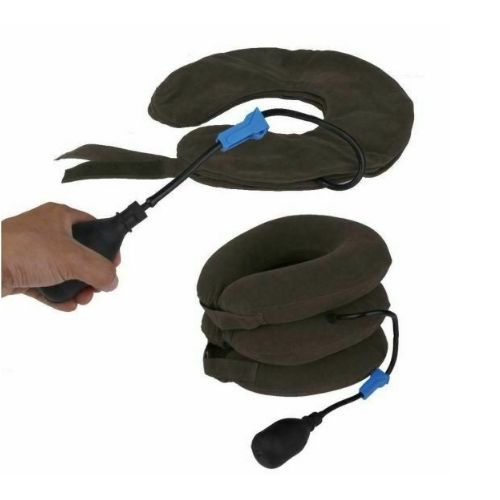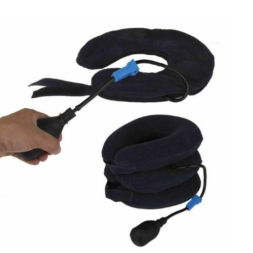 This inflatable neck traction device has a soft head and neck support. Properly position the unit under the jaw to partially unload the cervical spine and help support the weight of the head. It also helps keep the neck warm and serves as a reminder to limit head and neck motion.