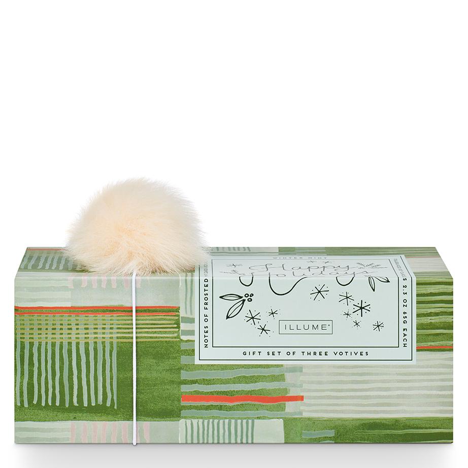 Packaged for festive giving, a trio of etched glass votive candles make a lovely present of seasonal scents. Tucked inside a gift box with a holiday message and a fuzzy, faux fur pom on top, these sets of three votives are ready to be placed under the tree.