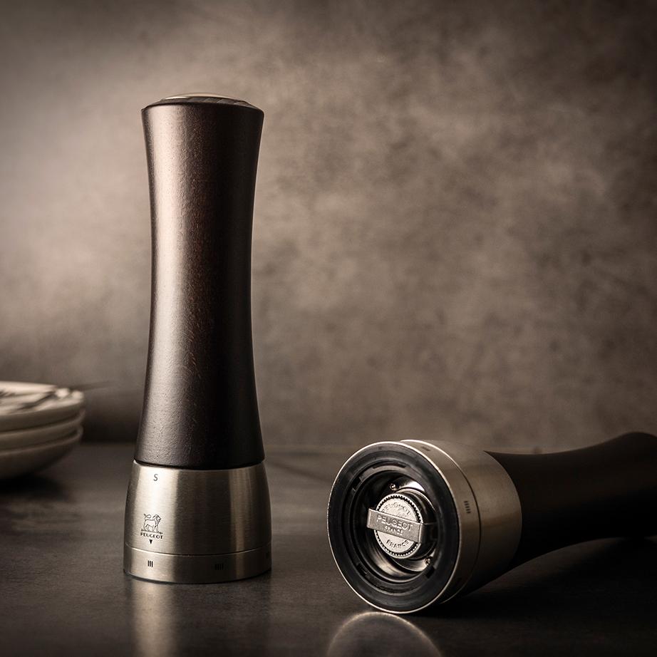 The rich chocolate finish of the Peugeot Madras Salt and Pepper Mills combines with stainless steel for a stylish look. Contemporary on the outside, innovative on the inside, the central vertical shaft of the Madras Mills has been eliminated, making it easier to fill them. Simply remove the magnetic stainless steel cover on the top of the mill to refill. Peugeot’s patented U-Select system makes the mill fully adjustable from fine to coarse or anywhere in between. Like all of their mills, Madras is equipped with Peugeot's renowned grinding mechanism, which comes with a lifetime warranty.