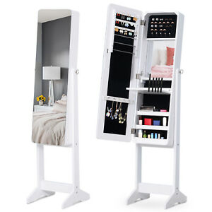 Freestanding Mirrored Jewelry Cabinet Armoire Organizer w/ Stand LED White
