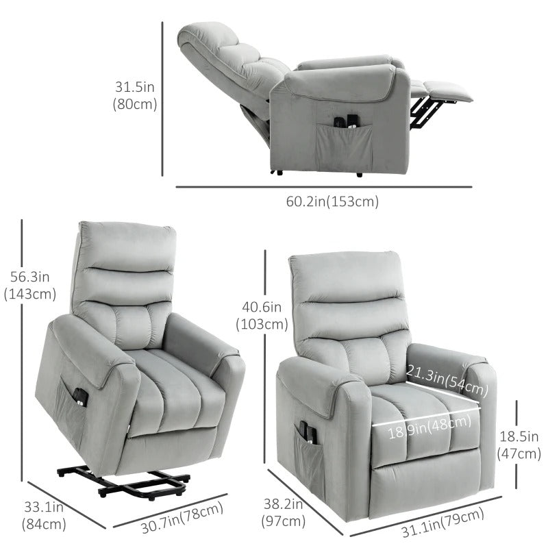 This power recliner chair from HOMCOM is comfortable and suitable for those with limited mobility. Easily transition from a standing position to fully reclined in seconds. Our power lift recliner for elderly are made with padded upholstery and soft velvet-feel fabric to provide exceptional comfort and relaxation. Includes 8 vibration massage points to relax you completely. Sink into comfort with this massage recliner chair.