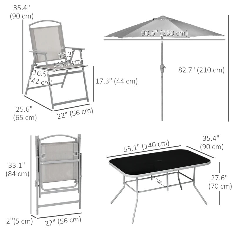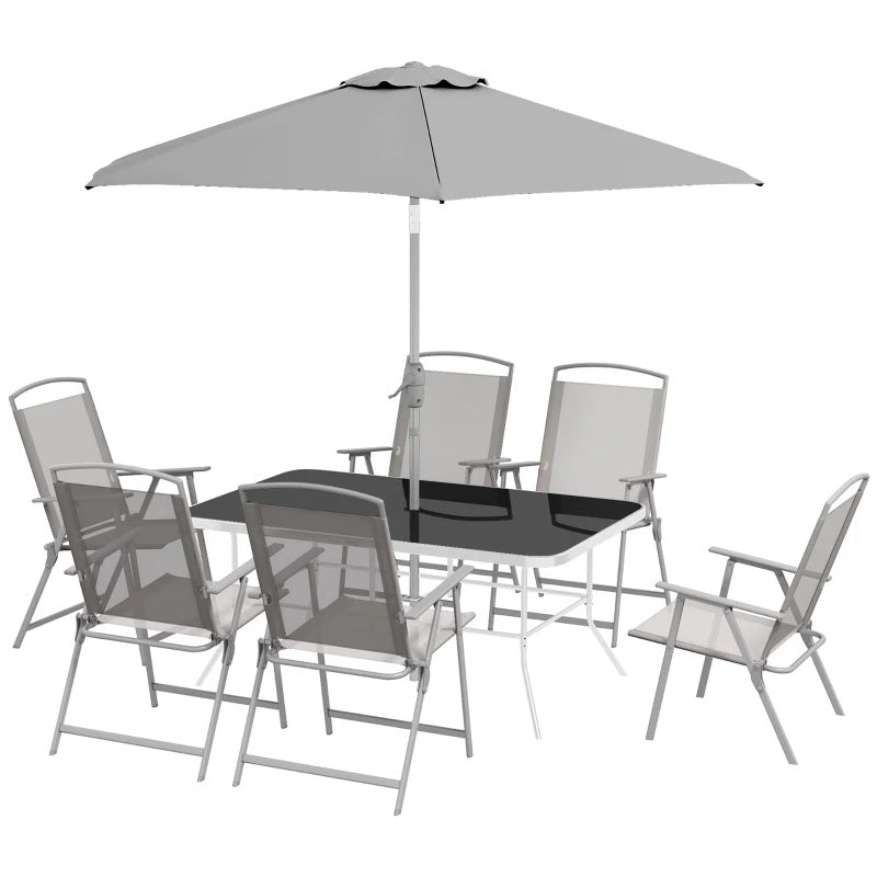 The Outsunny outdoor patio dining set for 6 consists of a tempered glass-top table, 6 folding chairs, and a removable umbrella. The umbrella can be quickly adjusted with an easy-to-turn handle and a tilt-control button on the pole, keeping you in a cool shaded spot when the sun is out. You can comfortably sit on the chair with breathable mesh fabric, enjoying drinks and meals while you lounge in the deck or patio. A perfect way to enjoy a cafe-style experience right outside your very own door!