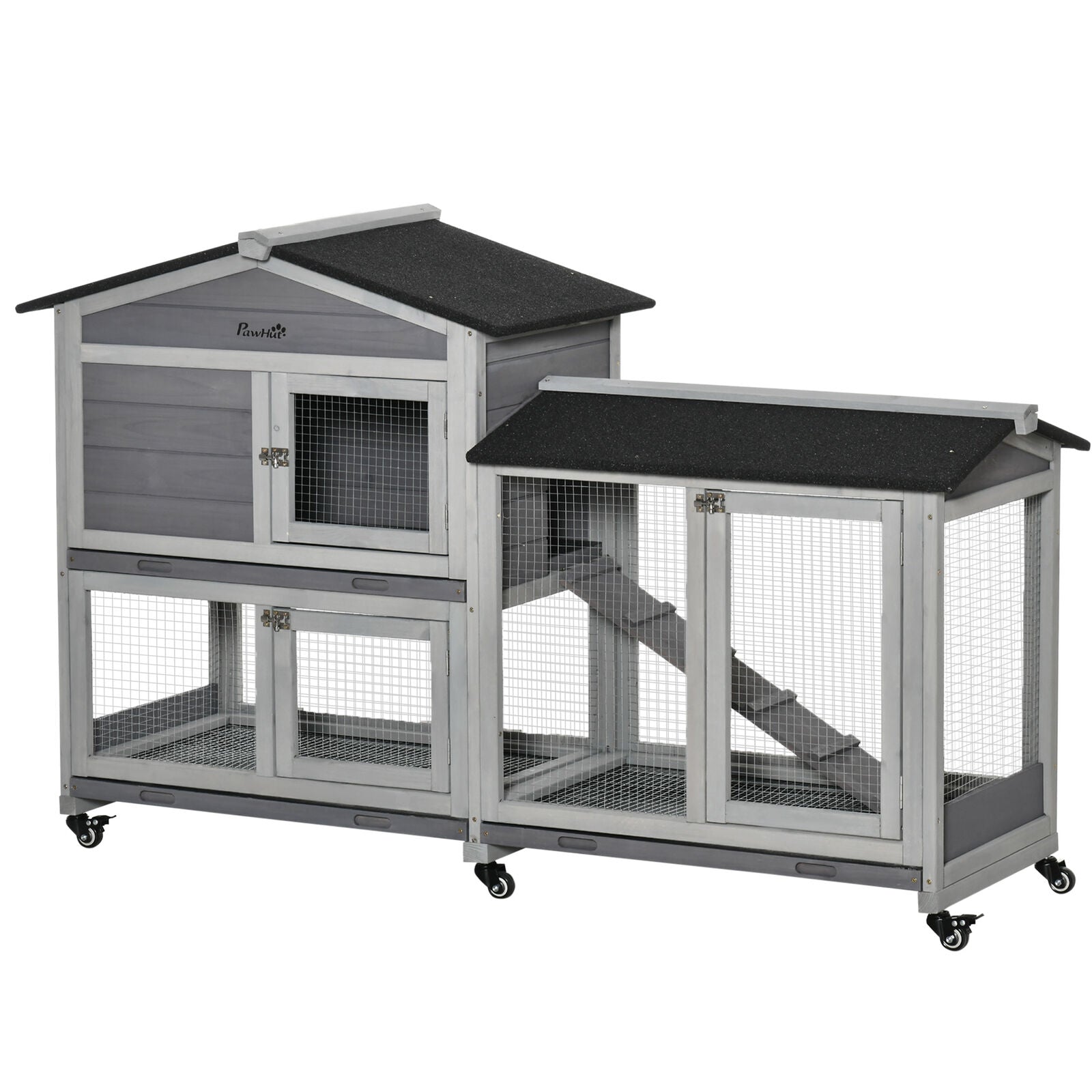 62" Wooden Mobile Rabbit Hutch with Wheels Run Box Slide Tray Ramp, Light Grey 196393161449