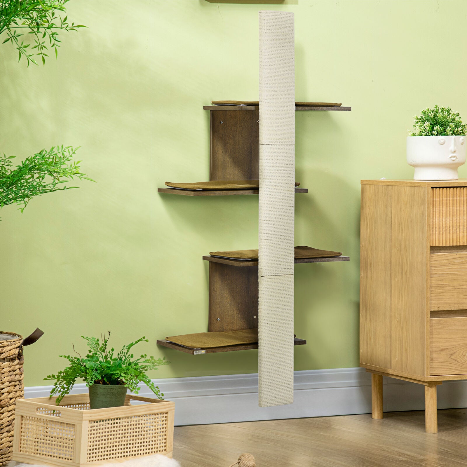 - PawHut cat shelf for wall consists of 4 jumping boards and a cat scratching post. It is made of beautiful, stable particleboard, and is easy to clean. The 4 jumping board allows your cute little cat to play and jump as well as to rest. The scratching board is made of jute to satisfy your kitten's clawing nature and prevent damage to your furniture. This cat stand is ideal for your lovely pets.