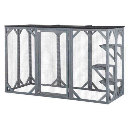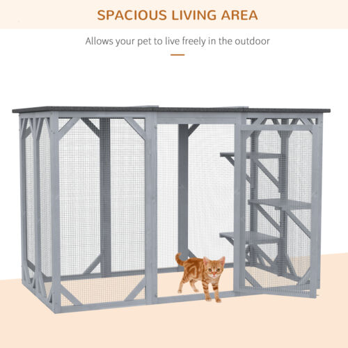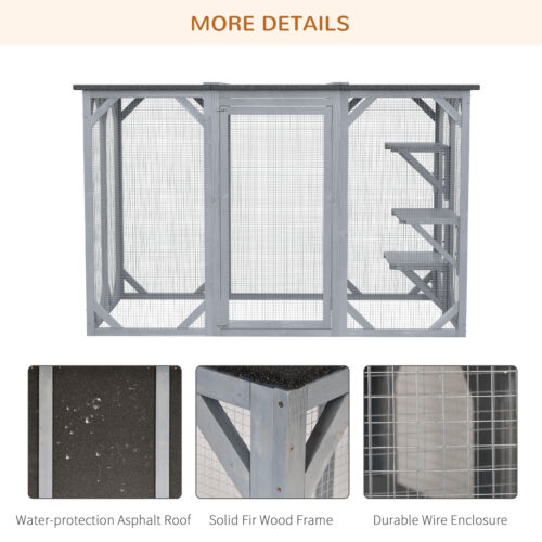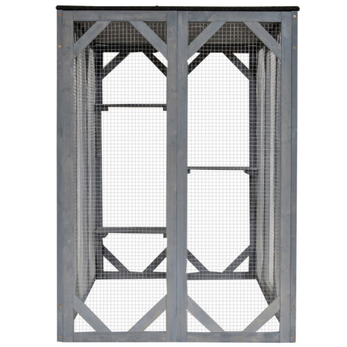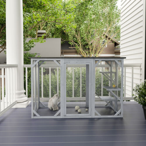 • This PawHut cat patio lets you open the back door patio for your kitties, giving them their own catio to roam around in. The large space can give furry felines a place to play while the sunlight streams in. Offering room to walk around, combined with triple tiered ledges, this mesh cat outdoor enclosure will gift your pets the luxury of climbing and lounging in the fresh air. For their comfort, the asphalt roof protects against dreaded cat-hated rainwater, while the housing keeps them safe.