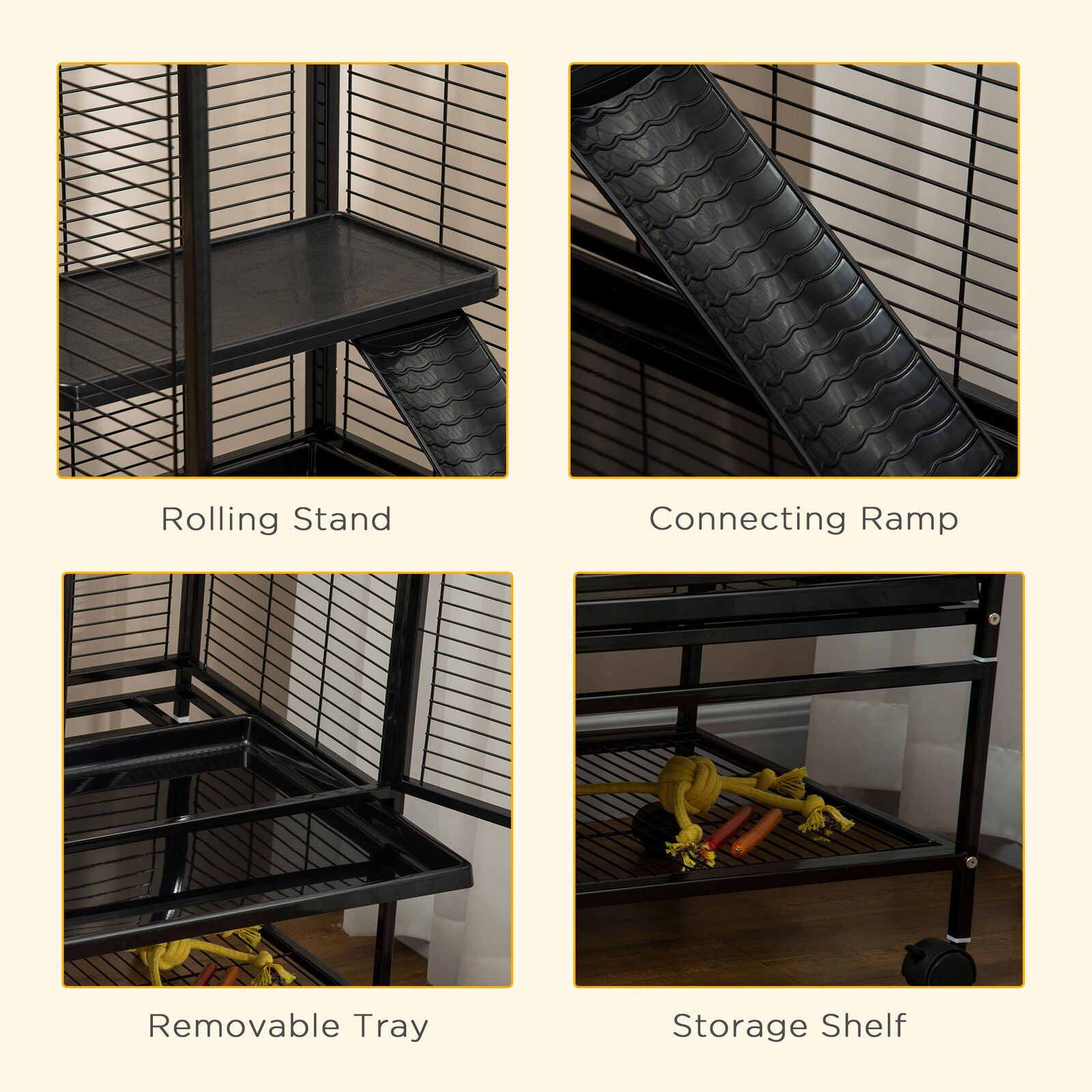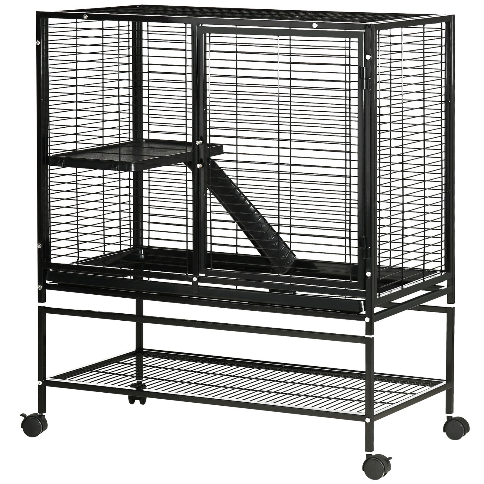 • The cages for small animals from PawHut make an ideal home for ferrets, chinchillas, guinea pigs and kittens. With two platforms and ramp, they'll have lots of space to play and exercise. And there is plenty of space for hanging toys, chews and hammocks. The metal frame keeps the kitten cage sturdy and strong, giving your pets a secure home. Four castors to move it around – two are lockable, keeping it in place when needed. With removable trays for simple cleaning, keeping their space tidy.