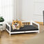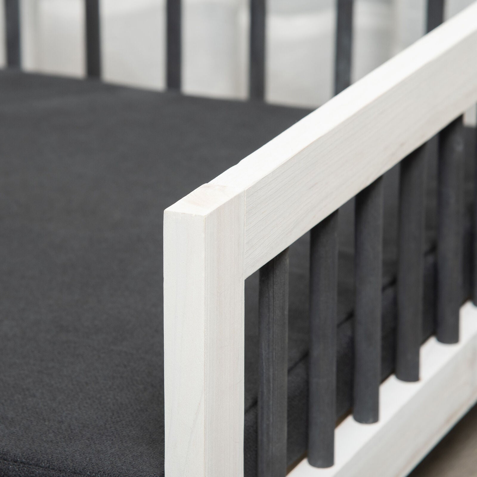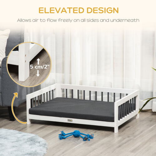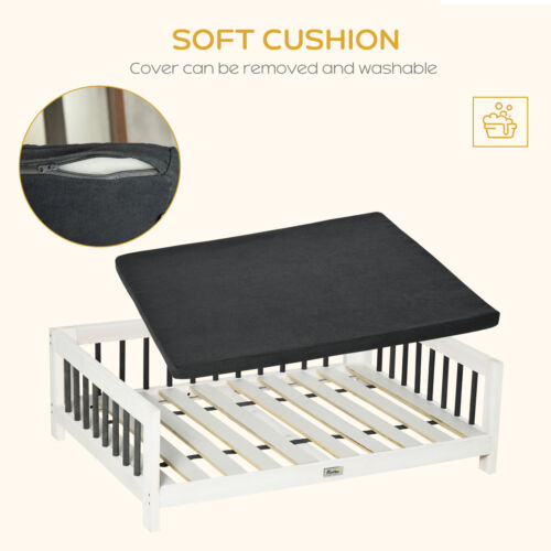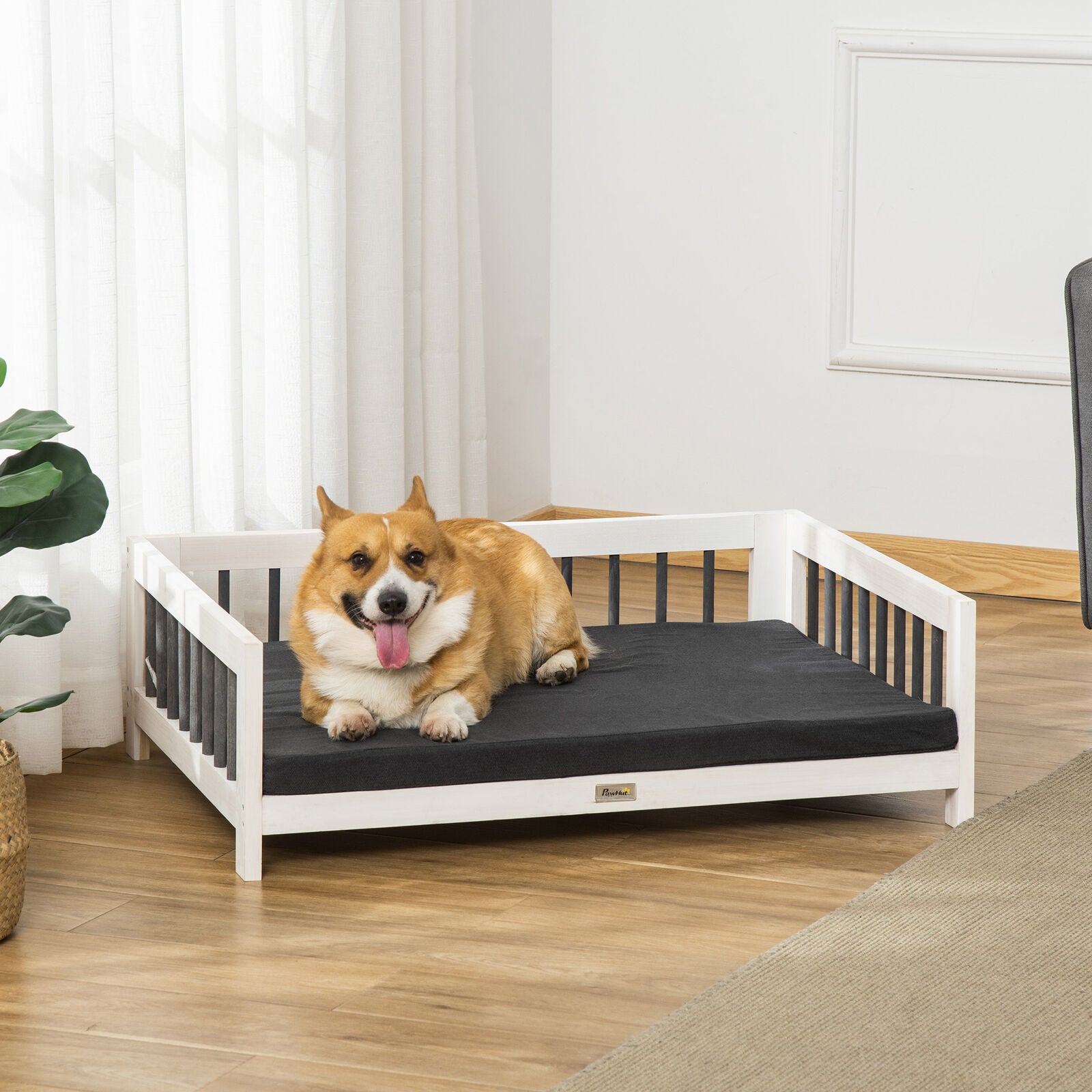 - This decorative black and white medium dog bed features a soft cushion to provide sponge support with comfortable foam, enhancing sleep. The pine wood is durable for high-quality materials, offering a reliable frame. Unlike thick cushions, the raised surface is cooler in the summer and the heat, keeping your pup feeling good throughout rest. On hot days, you can take the cushion off to make your pet feel even cooler. Let your dog sleep higher and elevated, using this indoor dog bed.