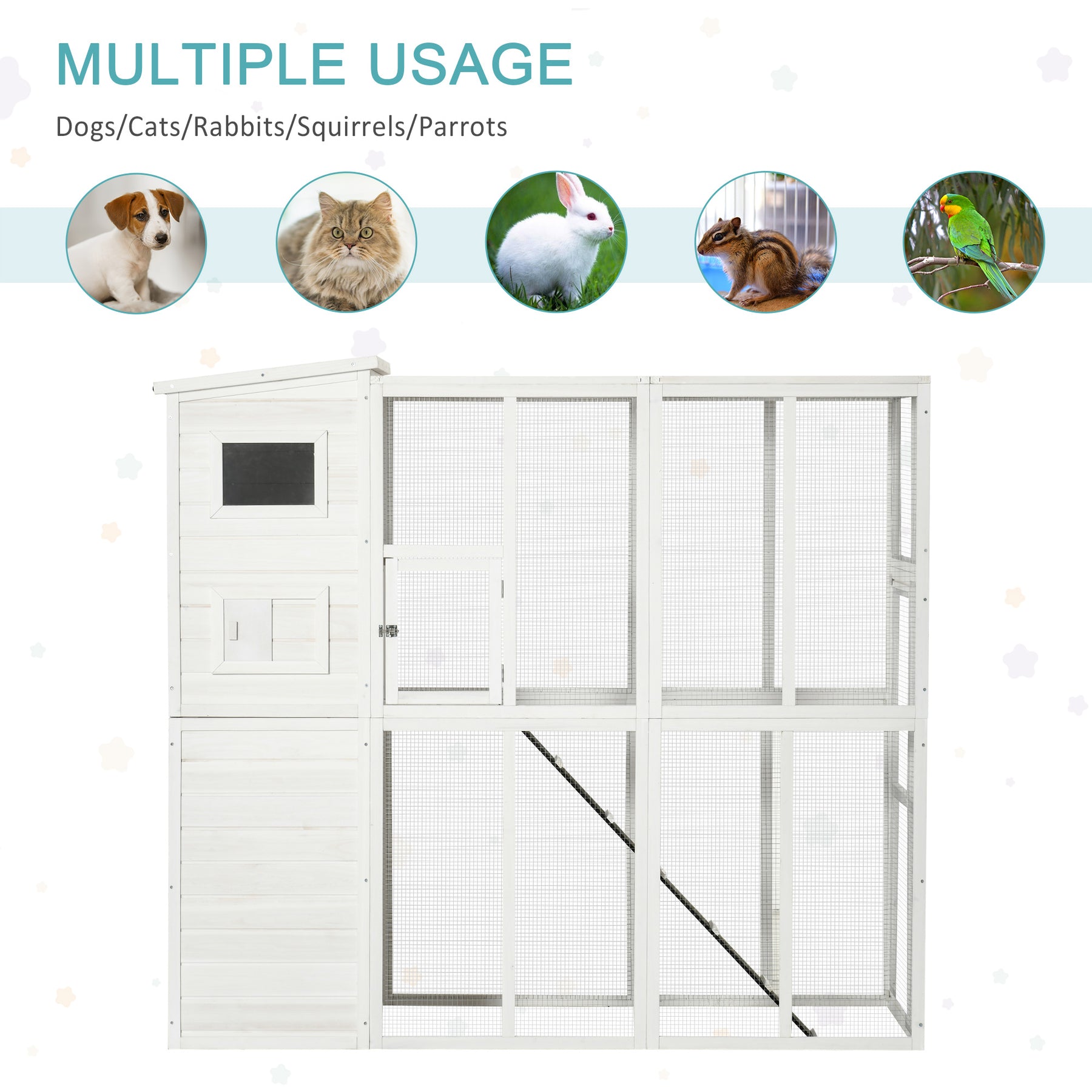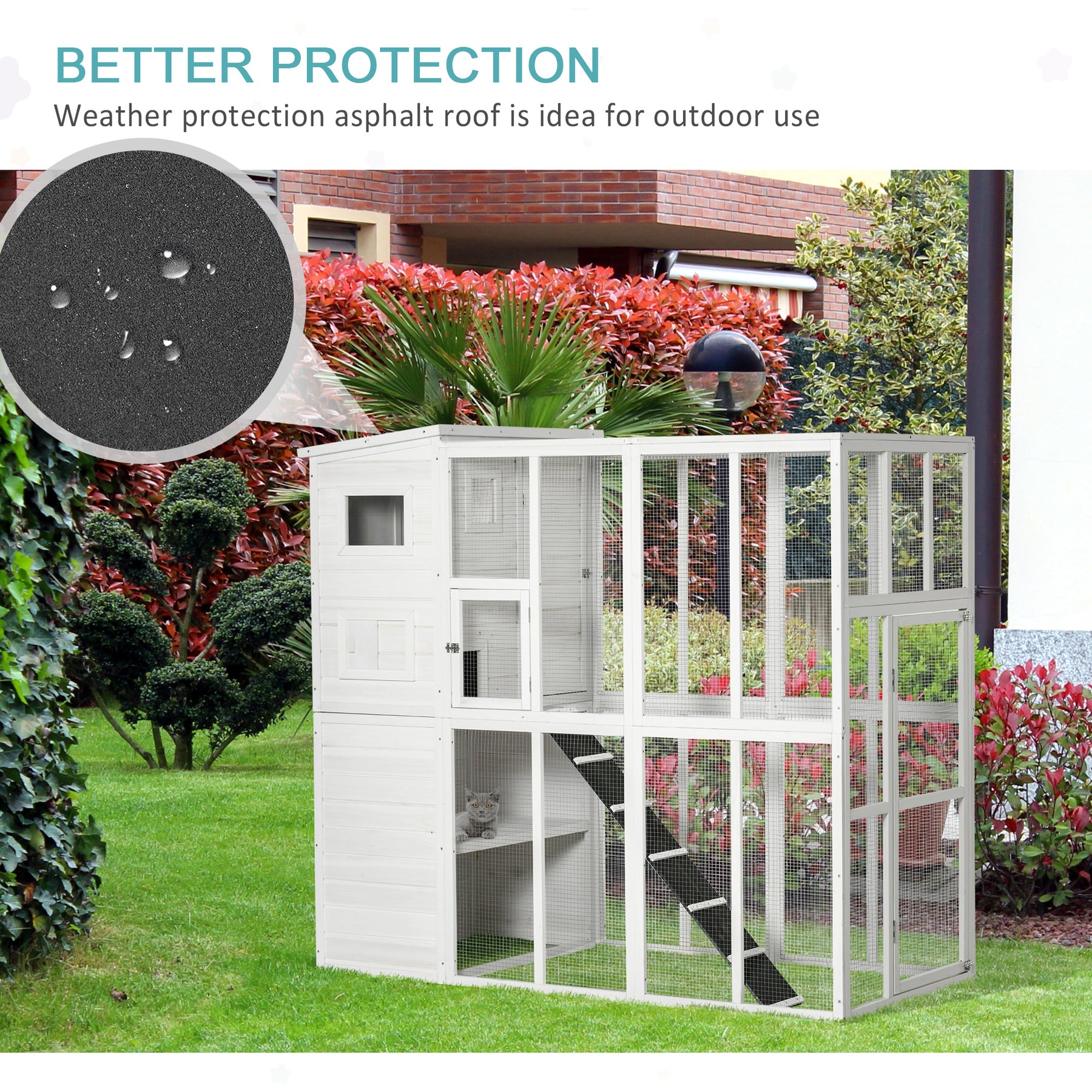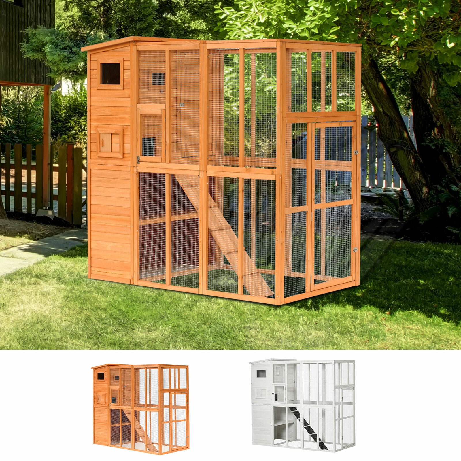 - Let this fantastic Pawhut large catio allow your cat to enjoy the great outdoors without the danger of roaming free. It is built on a sturdy wood frame that allows your pet to be outside without wandering freely. The flat roof has been covered with asphalt to help weather protection and keep your pet shaded from the sun and protected from the rain. This cat kennel is perfect for single or multiple pets and can house cats, dogs, squirrels, or small to medium pets.