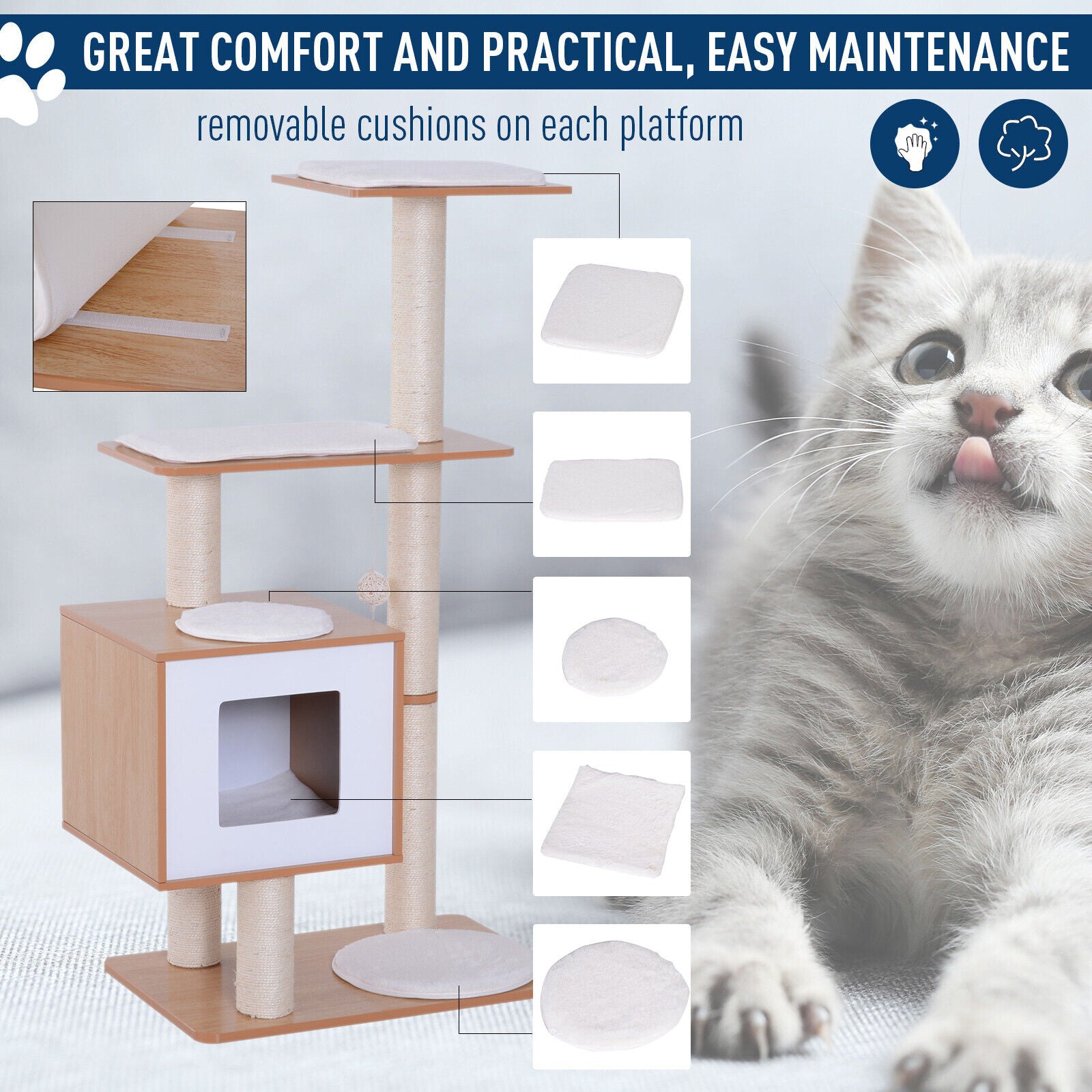 - This stylish yet practical cat furniture from PawHut satisfies the daily activity needs of fussy felines and the aesthetic tastes of cat lovers! Combining a cozy cube cave with numerous resting platforms as well as strategically placed scratching areas, this wood cat scratcher provides an enticing multi-level world for curious cats. Your furry friends will get limitless opportunities to climb, jump, play, take a nap, and enjoy endless scratching fun. Soft cushions and rounded corners give cats a gentle and secure environment. All cats, from kittens to seniors, will enjoy this multi-functional cat tree from PawHut!