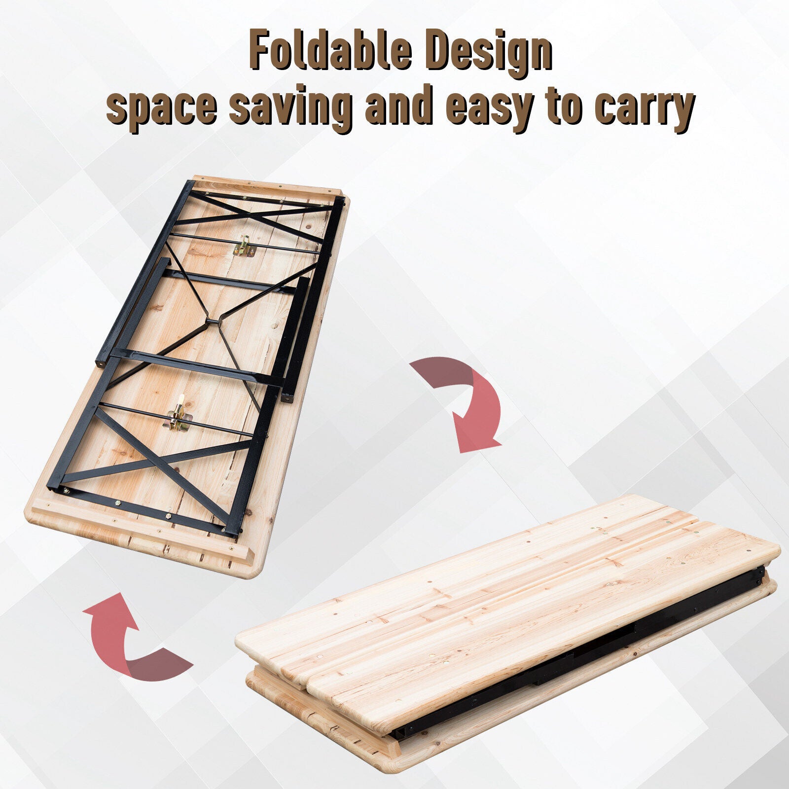 - Take this folding picnic table from the campsite, your backyard and more for fun in the great outdoors! The Outsunny 6 ft camping table set is suitable for outdoor or indoors or whenever you need an extra table or seating. Includes a compact, fold-out table and two bench seats with a classic, traditional, and timeless look. The solid wood tabletop and steel frame can be quickly set up or taken down.