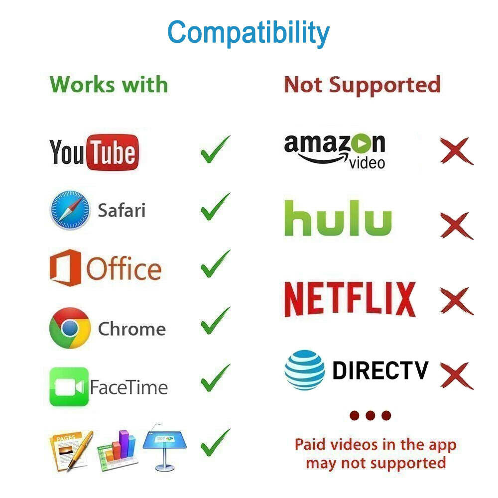 • NOT SUPPORT: APPs which have "HDCP" video copyrights protection like Netflix, Amazon video, HBO go, HULU, SKY Q and Honda motor. Please check it before purchasing.