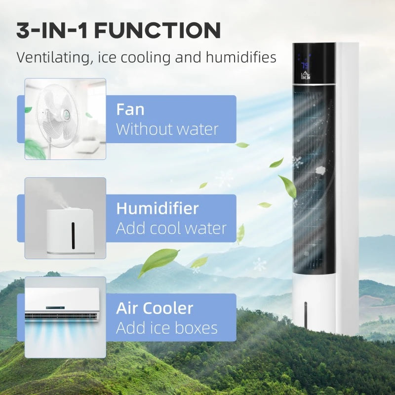 Keep cool this summer with this air cooler fan from HOMCOM. The hot, dry air passes through the water tank with ice packs, and the air becomes cool and moist as the water evaporates. The evaporative cooler cools down the room with less energy and comfortable humidity, providing a cost-effective solution compared to other traditional cooling methods, especially in arid climates. Enjoy incredible comfort in your living room, bedroom, basement, or RV. Make your house a home with HOMCOM!