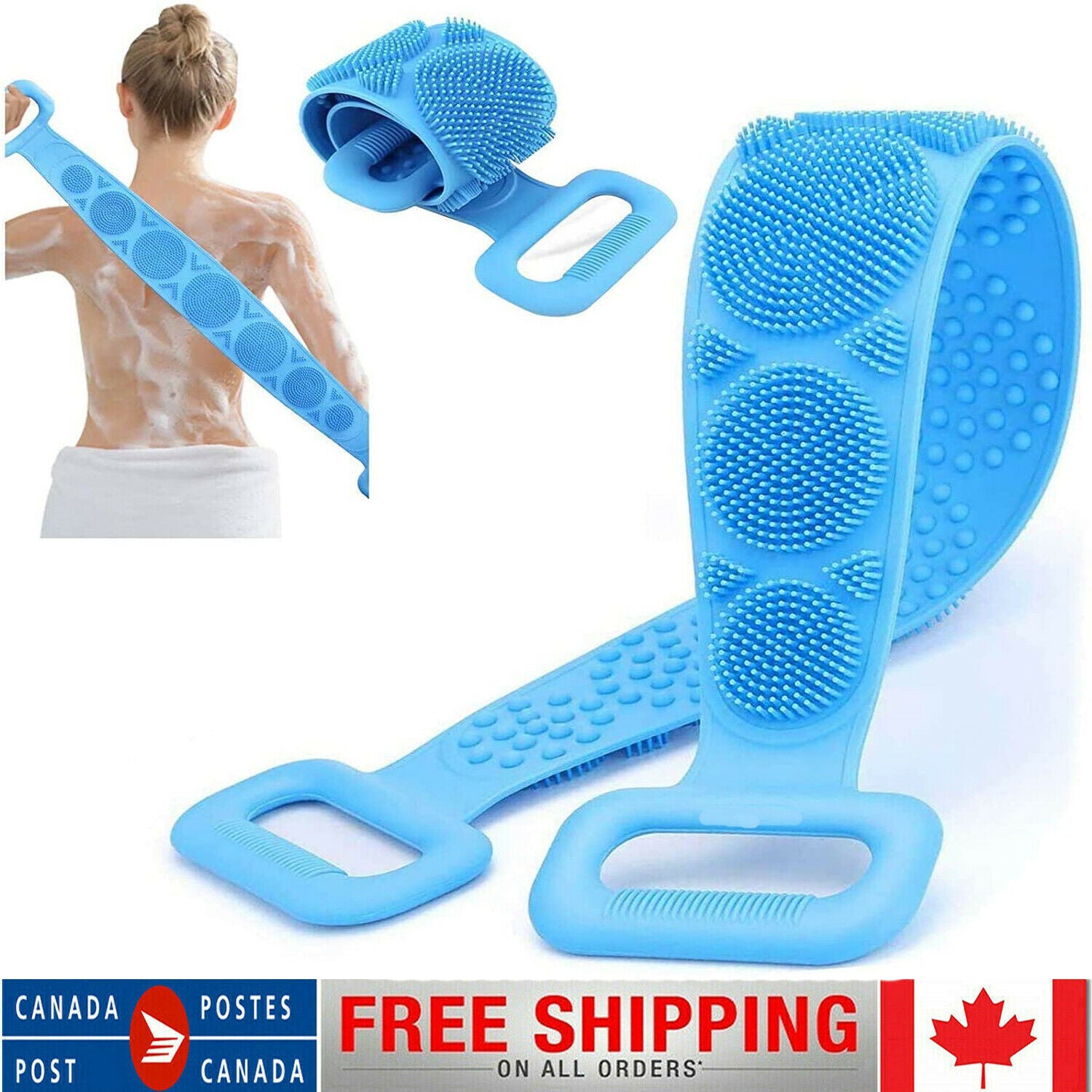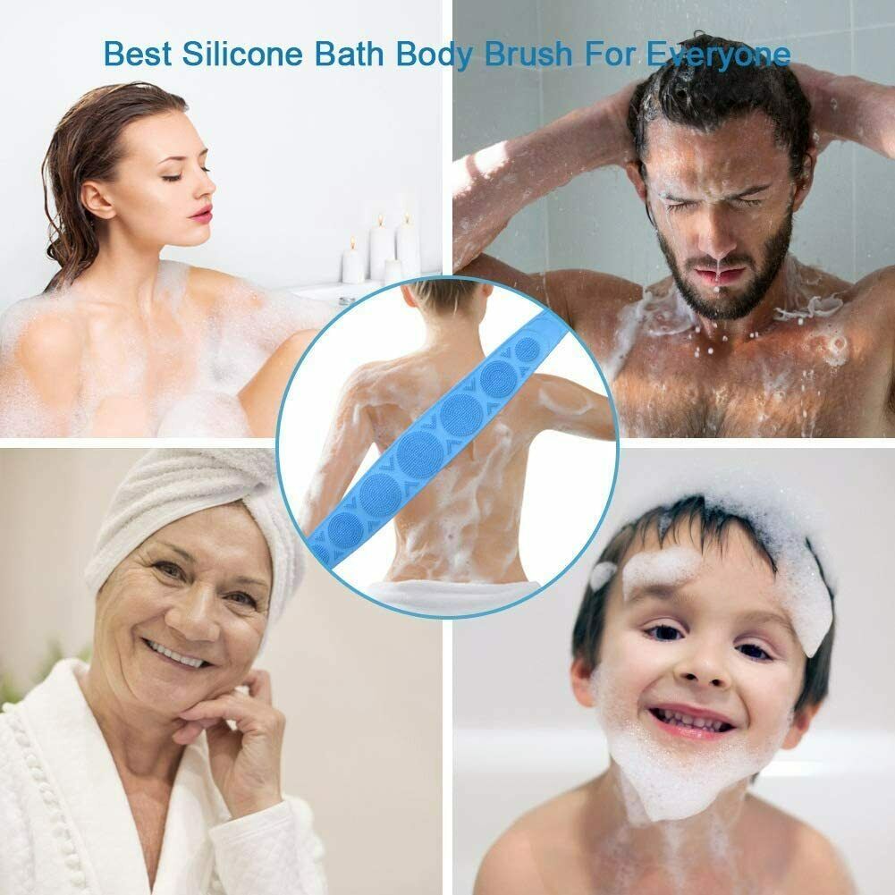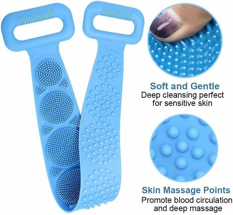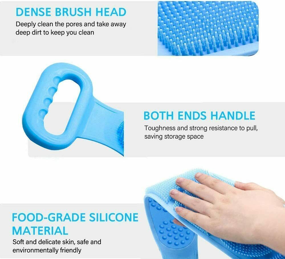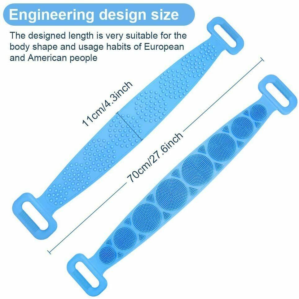 ãSoft and hard combinationã:The silicone shower brush is composed of two sections with different thickness and the other side is an elliptical structure. You can scrub different parts of the body in the bath as neededãEasy & Convenientã The skin on your back needs to be cleaned as much as other parts of the body. Our two-hand back scrubber allows you to easily reach all hard-to-reach areas, including feet and knees. Simply apply the shower gel you like on the side covered by the terry and scrub. The hooks of Silicone Back Scrubber can be easily hung and stored, saving space and drying quickly.ãThe Lengthen dimensionsã : Lengthen to 70 inches in length and 4.03 inches in width. You can put on body wash on it and move it across the back in both directions easily and effectively.ãfoamã : Gently rubbing can help you create a lot of foam.ãBest Serviceã We have an excellent customer service team. If you have any questions about our products, please feel free to contact us and we will give you a satisfactory answer as soon as possible. So there is no risk of you!Features:âMade of high quality grade silicone material, is resistant to high temperature, is not easy to rot, and is safe and durable.â Suitable for different groups of people ï¼Elderly, men and women.âWith handle, comfortable grip, convenient to use.â Double-sided design: One side can easily froth and exfoliate, the other side can massage the skin, and different functions can be selected according to needs.âSilicone material, quick dryingâGently rubbing can help you create a lot of foam.Specification:Material: SiliconeSize: 27.6 x 4.3 inch/72 x 11 cmColor: BlueGender: UnisexPackage include:1*Silicone Back Scrubber for Shower