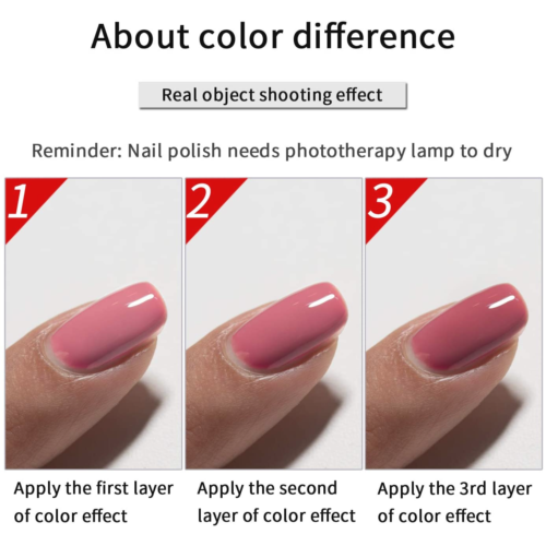 • Reminder: Cure under LED light 30-60 secs, UV light gel polish with glitter may be a little a thin layer evenly each time to avoid thickness.Require to use with base & top coat.