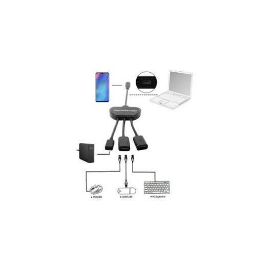3 in 1 cable adapter. You can insert U disk, keyboard, mouse and other equipment to the 2 USB port, and the other with a micro USB female, you can connect with charging cable and plug to provide power supply. The Type C male port can connect with cellphones, tablets, laptop, etc.